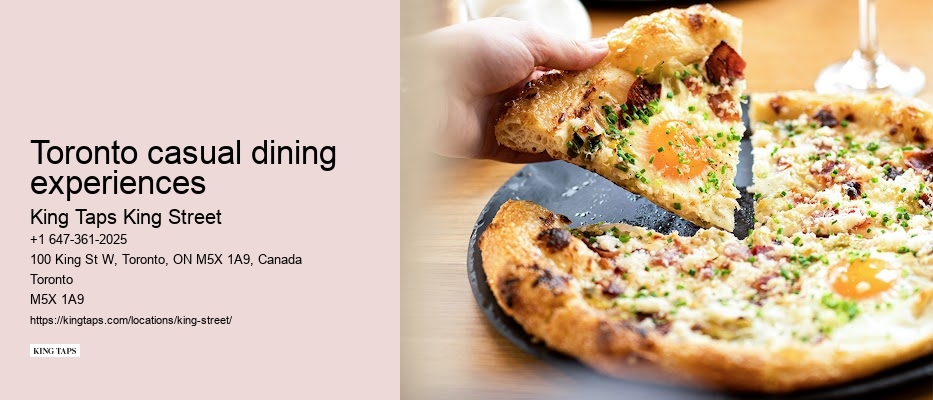 It's all part of the grand opening experience, crafted to provide you with unparalleled comfort and satisfaction. You'll find yourself captivated by the creativity on your plate, from the locally sourced ingredients to the international inspirations that infuse each dish with an extraordinary taste. So, grab a seat, pick a pint, and let's toast to the craftsmanship behind the brews. Each sip you take is a testament to King Taps' commitment to quality and variety. You'll get to sample a variety of unique brews, meet the masterminds behind them, and learn a thing or two about the art of brewing. Read more about King Taps King Street here. Text before the meta title text for each paragraph Toronto casual dining experiences Text after the meta title text paragraph